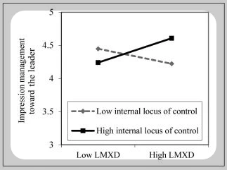 내적통제감(자신이 상황을 통제할 수 있다고 믿는 성향)이 높은 사람(high internal locus of contrl)의 경우, 팀장 앞에서 자신의 인상관리와 팀장과 자신의 관계의 질 관리에도 더욱 긍정적인 영향(잘 관리하는)을 미치는 것으로 나타난다. 반면, 내적통제감이 낮은 사람(low inernal locus of control)은 반대효과를 보였다. 이것은 내적통제감이 강한 사람이 주변인과의 관계나 자신의 이미지를 더 적극적으로 관리하려고 한다는 것을 의미한다. 일반적으로 내적통제감은 주도적인 행동에도 긍정적인 영향을 미치며 리더십 관점에서도 상황을 이끌고 가려는 자의론자적인 입장을 취한다.