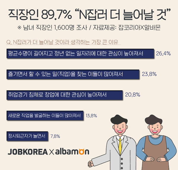 기업 입장에서는 머리가 아플 수 있다. 하지 말라고 하려니 업무시간 외적인 활동이라 명분도 서지 않고 뚜렷한 이유가 불분명하다. 업무 몰입이 약해지니.. 업무 기밀이 유출될 수 있으니.. 실제 기업에 몸 담고 있는 필자의 지인들(조직 관리자, 경영자)도 직원들의 이러한 N잡러 현상에 대해 표족한 해법을 찾지 못한 채 고민만 하는 모양새다. 그런데 다양한 설문결과들를 살펴보더라도 향후 N잡러는 더 빠르게 늘어날 전망이다.그 이유는 평균수명 연장과 즐기면서 할 수 있는 이들이 과거에 비해 더 많아 지기 때문으로 나타난다(잡코리아 & 알바몬, 2020).