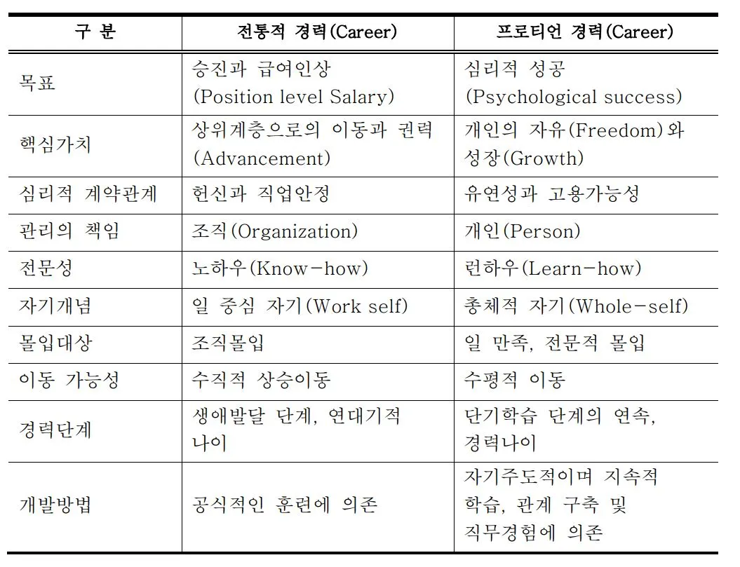 프로티언 경력의 핵심가치는 자유와 성장이다. 전통적 경력개념인 일-중심 자기(work-self)와는 다르게 총체적 자기(whole-self)를 중요하게 인식한다. 전통적 경력의 특징이 회사의 주도로 이뤄지는 수직적이고 직무기반의 경력이동 이라면, 프로티언 경력은 전문성 향상을 목표를 위해 개인 주도로 이뤄지는 역량기반의 경력이다. 경력에 대한 성공 기준도 차이를 보이는데, 임금, 승진, 직위, 권력과 같은 수직적이고 객관적인 경력 성공을 중시 여기는 전통적 경력과 달리 개인의 고유성에 기반한 주관적 경력성공을 중시 여긴다.