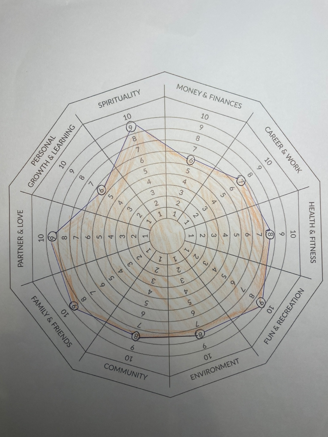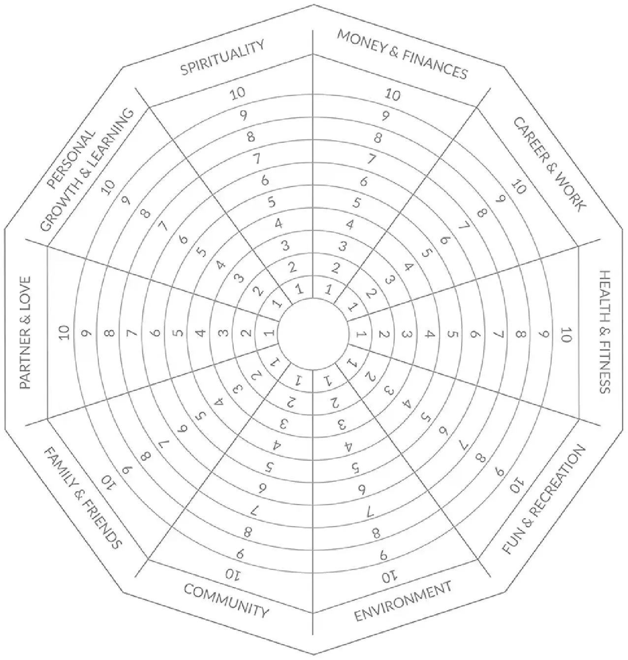 10가지 요소는 영적영역(Spirituality), 재무상태(Money&Finance), 건강(Health&Fitnes), 흥미(Fun&Recreation), 환경(Environment), 성장(Personal growth&Learning), 파트너와의 관계(Partner&Love), 친구(Family&Friend), 커뮤니티(community) 그리고 일과 커리어(Career&Work)이다. 개인적인 견해지만, 이 툴을 사용하는 바람직한 방법은 "풍족한 삶"에 대해 성찰에 있다. 만약 결과가 어느 몇 곳에 집중되어 있다면 불균형으로 인해 공허함을 느끼게 된다. 반면, 전체적으로 균형감이 있고 각각을 연결한 선의 내부 면적이 넓다면 풍족한 삶을 살아가고 있다는 의미로 해석할 수 있다.