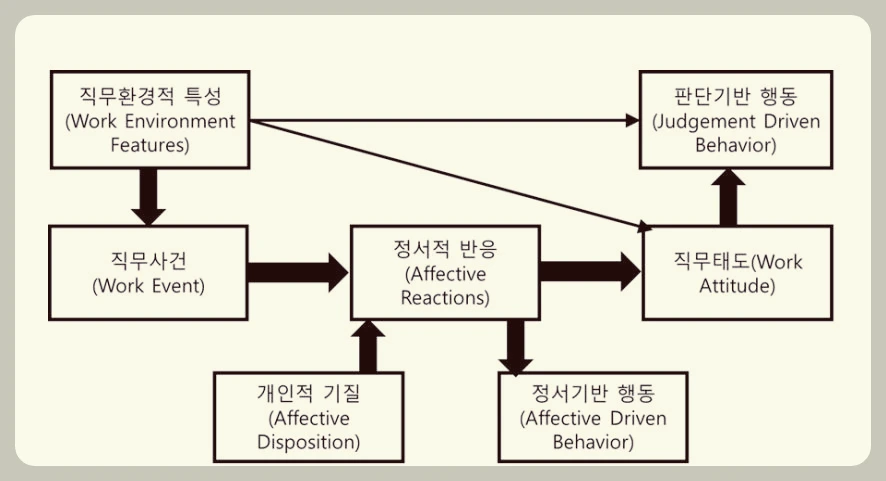 조직에서도 특정한 일이나 사건이 일어나면 구성원에게 정서적 반응(affective response)을 유발한다. 이 과정의 인지적, 행동적 메커니즘을 이해하기 위해 만들어진 개념이 정서사건이론(Affective Events Theory)이다(Weiss & Cropanzano, 1996). 조직에서 발생하는 일들이 구성원의 정서반응에 어떻게 유발되는지... 회사생활을 하면서 일상적으로 느끼는 감정이 업무환경과의 상호작용을 통해 태도와 행동에 어떻게 영향을 미치는지를 설명하고 있다. 성과도 당연히 정서반응에 따라 긍정 또는 부정의 태도 형성하여 영향을 받게 된다.