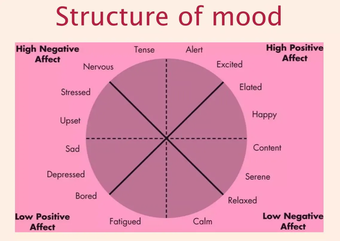 사람이 경험하는 감정은 방향성을 가지고 있다. 아래의 그림에서 각각 모서리에 있는 높고 낮은 긍정/부정적 정서는 서로 다른 감정들을 포함하고 있다. 또한 각각의 정서들은 중복영역이 존재한다. 즐거움, 호기심, 행복, 흥분, 열의 등이 모여 긍정적 정서를 만드는 반면 스트레스, 분노, 좌절, 불편감, 후회, 지루함, 피로함, 슬픔 등의 부정적 감정들이 총제적으로 기분을 형성하게 되는 것이다. 좋은 기분이라는 것은 이러한 감정들 중에서 긍정적인 감정의 상태를 유지하는 것을 의미한다.
