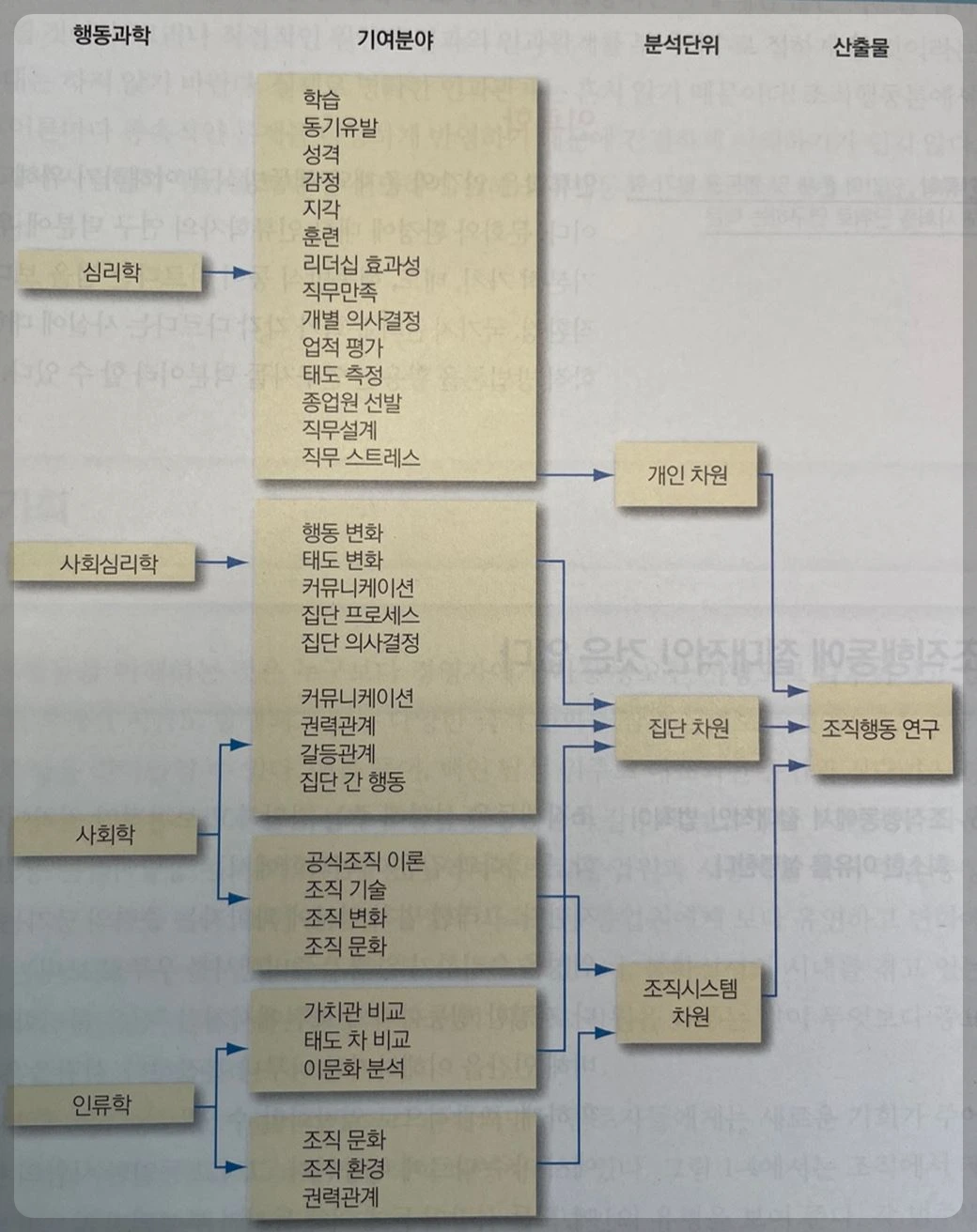 조직행동은 조직 내에서 개인의 행동을 주로 다루는 행동과학이다. 그렇기 때문에 심리학, 사회심리학, 사회학, 인류학의 이론적 바탕으로 현상을 설명하는 영역이다. 그 개념들을 살펴보는 것도 의미가 있을 것 같다.