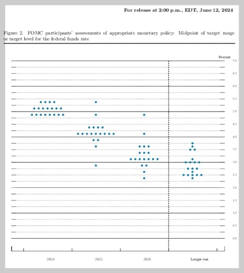 FOMC 연방공개시장위원회는 미국의 통화 정책을 결정하는 최고 의사결정 기구이다. 연 8회 정례회의 중 3,6,9,12월 정례회의 뒤에 점도표가 발표된다. 점도표는 19명 위원들의 금리 전망이 담긴 표이다. Fed사이트로 들어가서 'Monetary Policy' 메뉴를 찾은 후, 'Projection Materials'에서 점도표 확인이 가능하다. 하단이 연도, 오른쪽 세로는 금리가 표시된다. 점 하나가 위원 한 명의 의견이다. 결론적으로 6월 점도표 중간값은 5.1%이다.