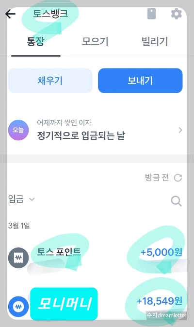 나는 모니 머니와 토스 포인트를 토스뱅크로 출금했다. 토스뱅크에서 하루 이자 받기 하는 것에 보탰다.