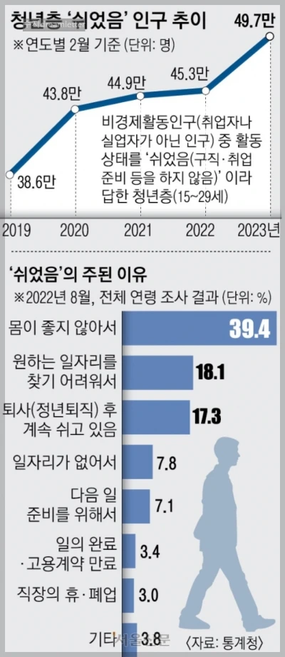 '쉬었음' 인구를 아시나요? 말 그대로 아무것도 하지 않고 쉬었다는 뜻인데요. 구직 활동을 하는 미취업자 하고는 다른 개념이고요. 15~29세 청년층의 '쉬었음' 인구가 50만 명에 이르게 되면서 2003년 1월 통계 작성 이래 역대 최대 규모라고 합니다. 통계청에서는 '쉬었음'의 이유를 매년 1회 조사를 합니다. 지난해 8월의 조사 결과를 보면 1위가 '몸이 좋지 않아서'이고요. 2위가 '일자리, 일거리를 찾기 어려워서'라고 하는데요. 이것은 청년층의 응답만 있는 것이 아니고, '쉬었음' 인구의 43.6%를 차지하는 60세 이상의 답변도 포함이 된 전 연령 조사의 결과이기 때문입니다.