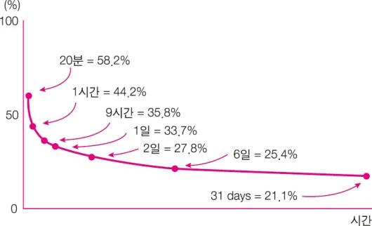 에빙하우스 망각 곡선, 출처: 네이버 지식백과 재인용, Anderson, J. R. (2012). 인지심리학과 그 응용. 이영애 역.