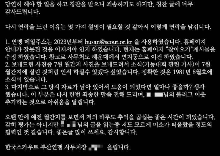 아쉽게도 그 당시 썼던 글은 찾을 수가 없었습니다. 하지만 스카우트 부산 연맹의 친절한 직원분의 도움으로 그 당시 책자에 역사 기록까지 찾는 데는 성공한 것입니다. 다시 한번 그분께 깊은 감사를 드립니다. 알지도 못하는 저의 어린 시절 궁금증을 풀어 주기 위해 창고 깊숙이 보관하고 있던 책자를 찾아서 확인해 주신 그 정성에 너무 감사한 마음이 듭니다. 다시 문자가 왔습니다.알고 보니 그분은 부산연맹 사무처장님이셨습니다.