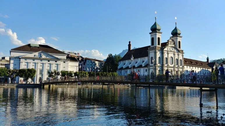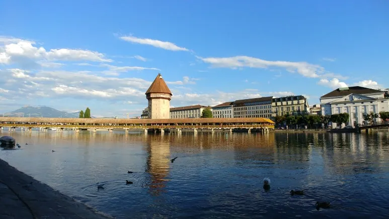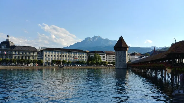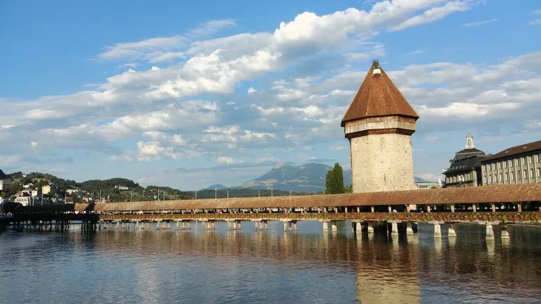 루체른의 상징인 가펠교로 이동했다. 로이스 강 위에 건조된 유럽에서 가장 오래된 지붕이 있는 목조 다리라고 한다. 물 위에 떠 있는 듯한 가펠교는 멀리 높은 산과 하늘을 배경으로 웅장하지만 고풍스러운 느낌이었다.