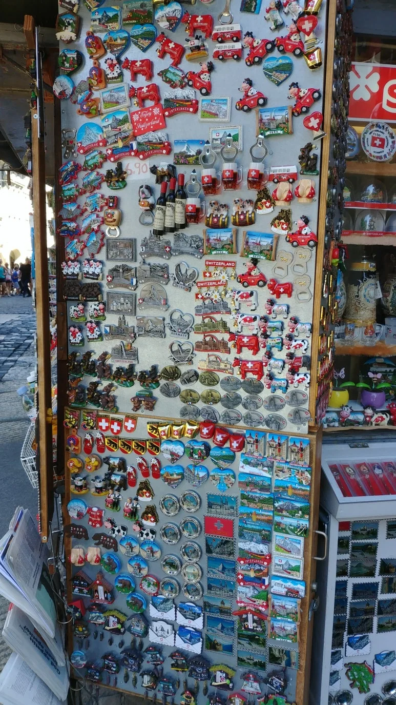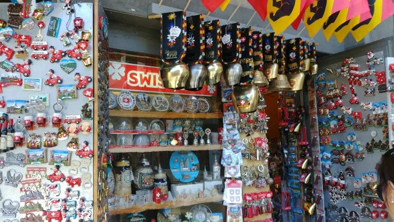 기념품 가게가 많았다. 주로 빨간색 계열의 기념품들이 많아서 그 화려함에 눈을 떼지 못했다. 참새가 방앗간을 그냥 지나칠 수 없었다. 기념이 될만한 냉장고 자석류와 스위스 종(카우벨)을 구매했다.