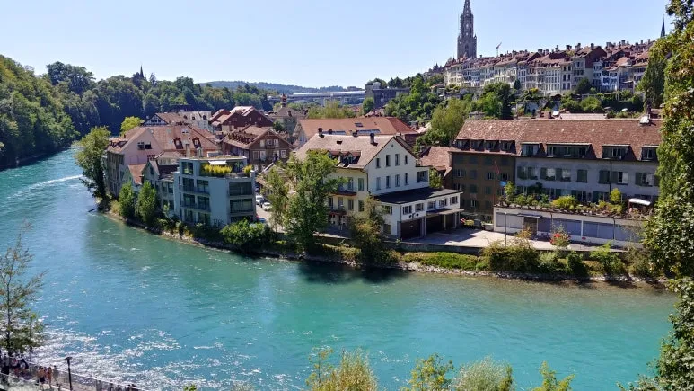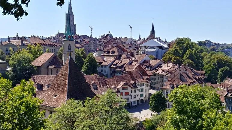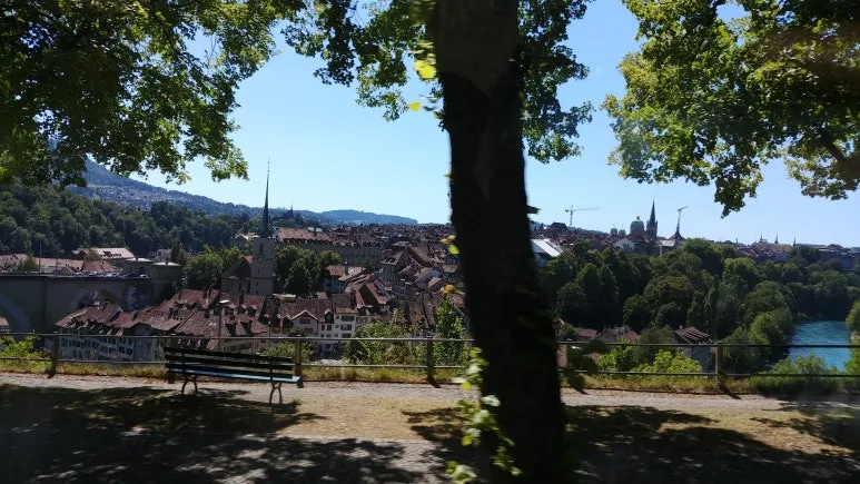 구시가지 베른의 모습이 나타났다. 집들의 붉은 지붕이 인상적이었다. 마을 전체가 거의 같은 색의 지붕이었다. 아레강(Aare River) 이 마을을 감싸고 있어 천연 요새 같은 느낌도 들었다.