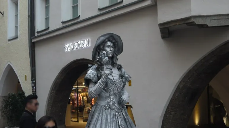 인스브루크에도 길거리 퍼포먼스를 하고 있었다. 장미를 들고 마치 동상처럼 꼼짝하지 않고 서 있다가 움직이는 모습을 보니 역시 사람이었다. 움직이지 않고 동상 퍼포먼스를 하는 것도 대단한 인내력이 필요한 직업이었다. 마리아 테레지아 거리였으니 아마도 그녀를 형상화하는 듯했다.