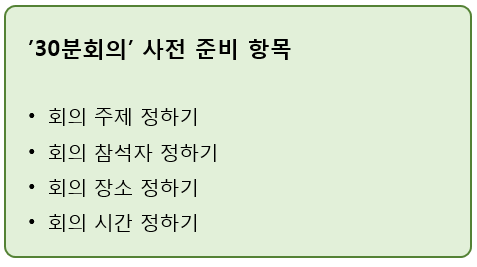 회의를 공지하기 위해서는 사전 준비가 필요하다. 사전 준비는 '30분회의'를 공지하기 전에 회의 주관자가 해야 할 일을 말한다. 주제 선정에서부터 장소 섭외까지 사전에 신경 써야 할 일들이 많다.