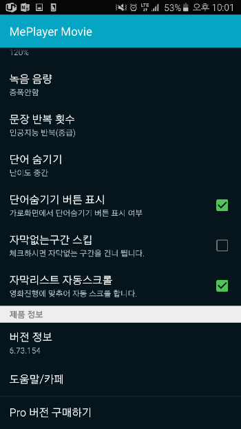 여러가지 설정을 할 수 있습니다. 특히 [자막없는 구간 스킵] 기능은 자막이 있는 곳만 뛰어 넘어서 실행하기 때문에 대사 중간에 영상이 너무 많다면 체크해서 대사만 공부할 수 있는 기능입니다.