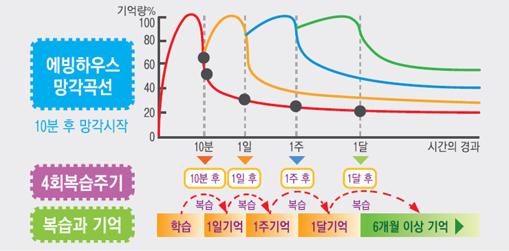 그래서 새롭게 학습된 항목은 가능한 한 즉시 2차 반복이 되어야 하고 서서히 간격을 늘려가면서 세 번, 네 번 반복되어야 우리의 기억속에 오래 남게 된다는 것이죠.