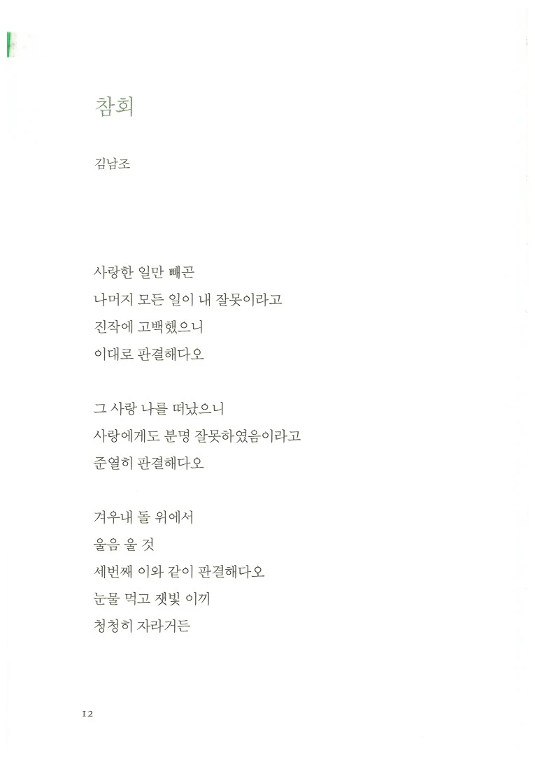 제1부의 제목은 '사랑말고는 다 고백했으니'다. 이것은 김남조 시인의 <참회>와 관련이 있다. <참회>의 1연은 '사랑한 일만 빼곤/나머지 모든 일이 내 잘못이라고/진작에 고백했으니/이대로 판결해다오'다. 1연의 4행만 제외하고 문맥을 다듬으면 '사랑말고는 다 고백했으니' 정도가 될 것이다. 그런데 '사랑에게도 분명 잘못하였음'이라고 한다. 그러므로, '사랑한 일만 빼곤 나머지 모든 일'과 '사랑'에게 잘못하였기에 모든 것이 다 본인의 잘못이다. 그 결과로 화자는 운다. 감정의 응어리를 표출한다. 카타르시스다. 이 과정을 통해 젊어지고, 새봄이 온다. 그런데, 젊음과 새봄에도 불구하고 다시 참회하겠다고 한다. 김남조 시인에게 사랑이 그렇다. 사랑 빼고 모두 잘못한 것 같고, 사랑 자체에도 잘못이 있는 것 같고, 그래서 자신을 차가운 돌 위에 세워두고야 마는 것.