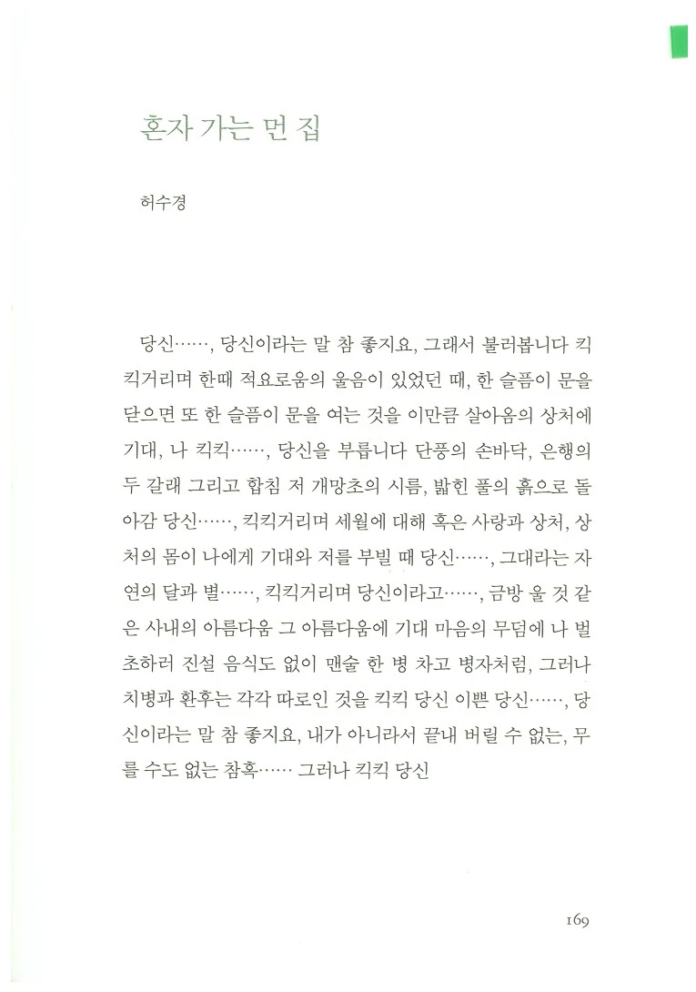 책 제목이자 제4부의 제목은 '당신이라는 말 참 좋지요'다. 이것은 허수경 시인의 시 <혼자 가는 먼 집>의 시구에서 따왔다. '당신'이라는 말의 뜻은 무엇일까. 국어사전을 찾아보니 무려 뜻이 다섯 가지나 된다. 1. 듣는 이를 가리키는 이인칭 대명사. 하오할 자리에 쓴다. 2. 부부 사이에서, 상대편을 높여 이르는 이인칭 대명사. 3. 문어체에서, 상대방을 높여 이르는 이인칭 대명사. 4. 맞서 싸울 때 상대편을 낮잡아 이르는 이인칭 대명사. 5. '자기'를 아주 높여 이르는 말. 이 시에서의 '당신'이란 아마 첫 번째 또는 두 번째 의미일 것이라고 추측한다. 허수경 시인이 참 좋다고 한 그 '당신'이라는 말은 '킥킥' 웃음소리와 함께한다. 허나, 내용을 보면 마냥 우습지만은 않다. 삶의 희로애락이 있다. 그러나, '킥킥'이라는 명량한 소리와 함께하기에 가볍지만은 않은 삶을 '당신'이라고 불리는 타인과 함께 살아갈 수 있다.