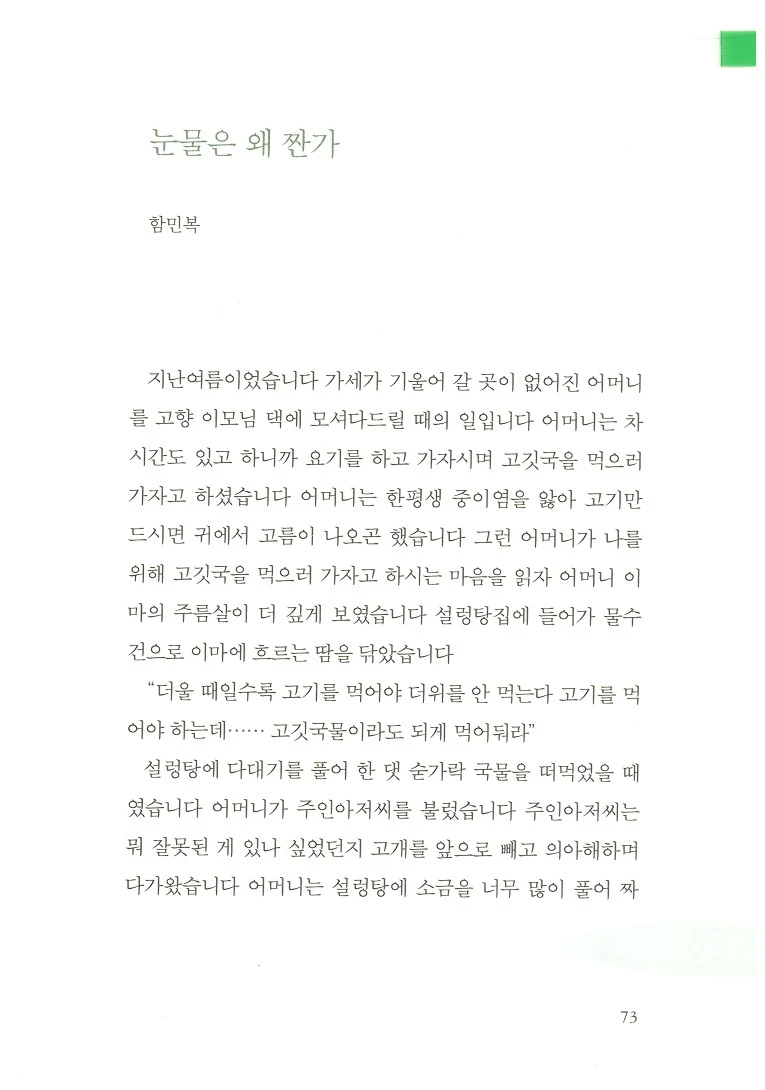 제2부의 제목은 '눈물은 왜 짠가'다. 이것은 함민복 시인의 시 <눈물은 왜 짠가>의 제목에서 따왔다. 내가 고등학생 때 문학 자습서에서 이 시를 접한 기억이 있다. 이 시는 산문시라서 이해가 어렵지 않다. 화자는 가난한 자신을 눈치껏 챙겨주는 어머니와 설렁탕집 주인아저씨의 배려에 땀인양 눈물을 훔친다. 생각해 보면, 가난이란 게 꼭 나쁘지만도 않다. 가난한 날에만 할 수밖에 없는 행동과 그로 인해 느끼는 감정이 있다. 그러므로 화자와 어머니와 설렁탕집 주인아저씨의 술어는 동질감을 이룬다. 그리고 나는 내가 누리지 못한 '가난한 서정'을 느껴보기 위해 오래전에 발행된 함민복 산문집 <눈물은 왜 짠가>를 약간은 충동적으로 서점에서 구매했다. '온전히 살기 위해 버텨 온 날들, 그 안에 먹먹히 절은 삶의 풍경들, 잊고 있던 서정의 맛'(표지)이 '눈물은 왜 짠가'라는 여섯 음절에 담겼다. 러게, 눈물은 왜 짤까요.