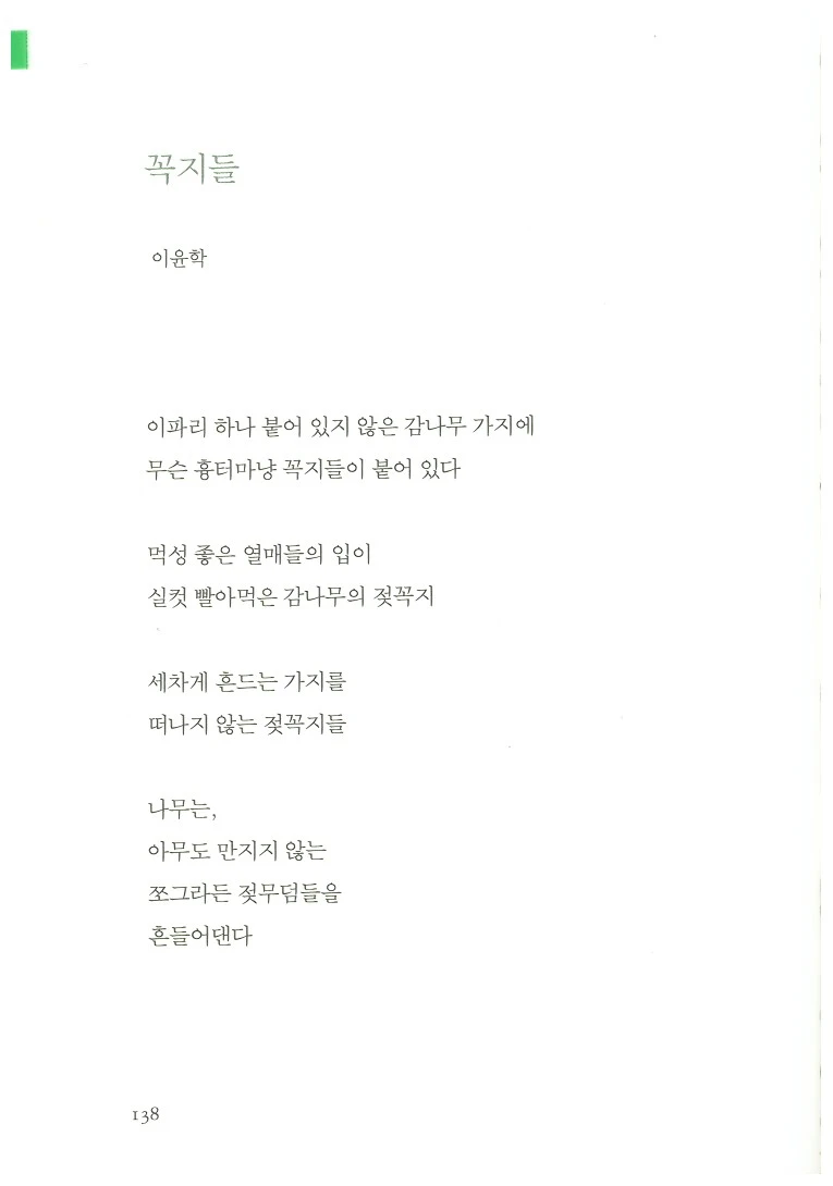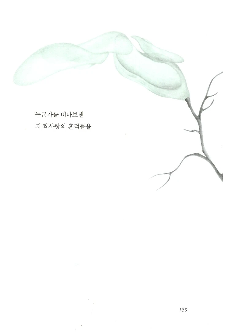 제3부의 제목은 '짝사랑의 흔적들'이다. 이것은 이윤학 시인의 시 <꼭지들>의 시구에서 따왔다. '이파리 하나 붙어 있지 않은 감나무 가지'의 '꼭지들''짝사랑의 흔적들'이라고 한다. 꼭지들을 부모, 열매들을 자녀로 치환할 수도 있겠다. '빈 둥지 증후군'이 떠오르는 시다. 그런데 나에게는 '빈 둥지 증후군'을 떠올리는 1연, 2연, 5연만큼이나 3연과 4연도 인상 깊다. 꼭지들은 왜 가지를, 나무를 떠나지 않을까. 이에 대한 대답이 '열매들을 기다리기 때문'일 수는 없다. 열매들은 이미 꼭지들을 떠났고, 돌아오지 않거나 돌아오지 못할 것이다. 적어도 내 생각에는 꼭지들에게도 생애에 대한 욕심이 있기에 가지든 나무든 떠나지 않는다. 그 욕심이 흔들림을 만든다. 그리고 역설적이게도 흔들림은 열매들이 있어 만끽하지 못했던 자유로움을 꼭지들에게 만들어준다.