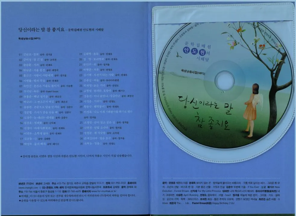 책 <당신이라는 말 참 좋지요>의 끝부분에는 '이 책의 시인들'과 '작품출전'이 담겨있다. 그리고 육성낭송시집(MP3)라고 CD 한 장이 붙어있다. 요즘엔 자주 사용되지 않는 도구지만, 이 책이 발간되었을 무렵에만 해도 CD가 자주 사용되었고 더불어 CD 플레이어도 유행하는 아이템이었다. 오랜만에 CD를 들어봐야겠다고, 시를 더 느껴봐야겠다고 생각했다.