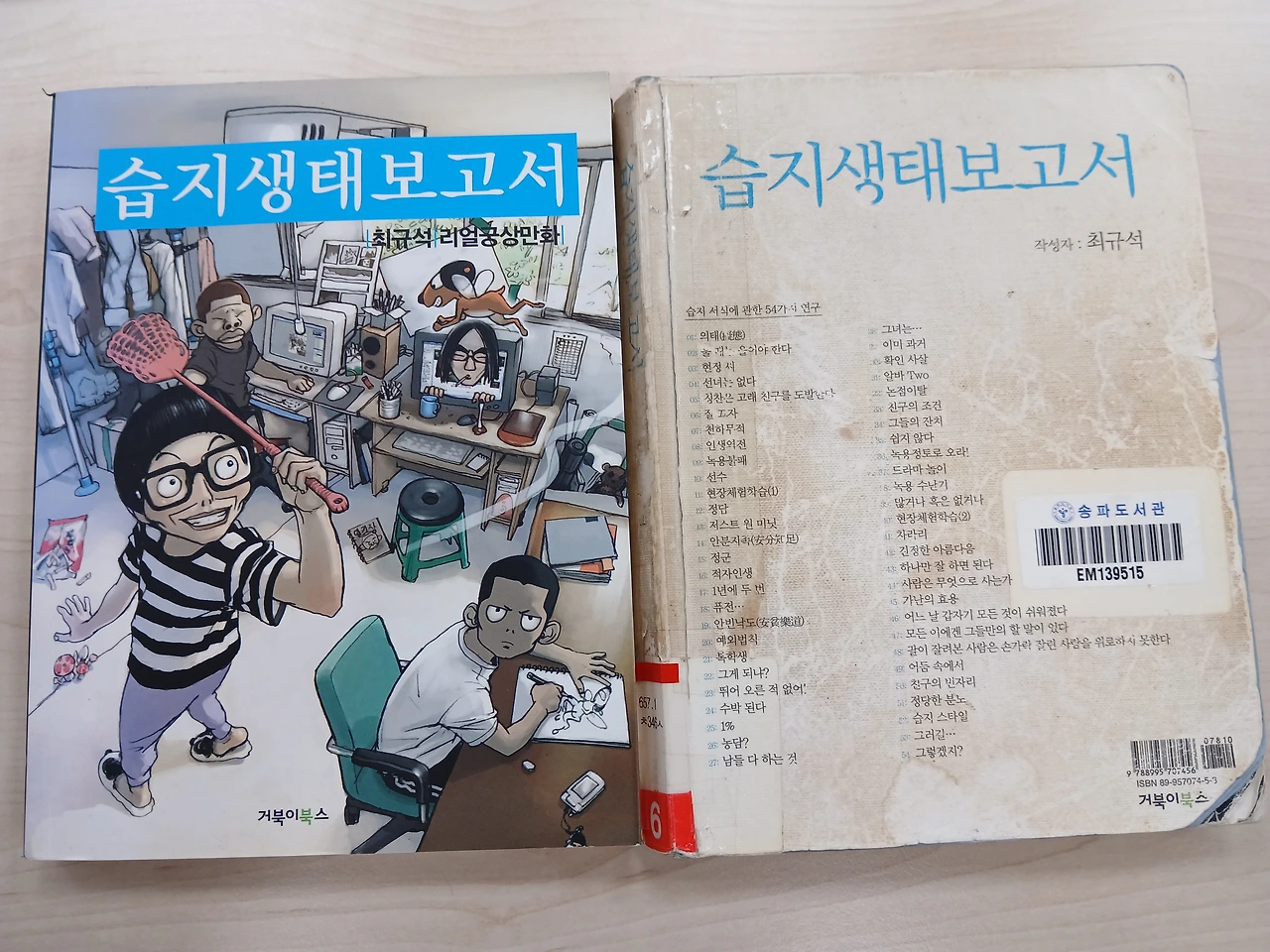 <습지생태보고서>는 거북이북스 출판사에서 출간되었다. 왼쪽의 것이 내가 산 책이고, 오른쪽의 것이 도서관에 있는 책이다. 내용은 모두 똑같지만, 겉이 다르다. 어쨌든, 이 책은 2005년 ≪경향신문≫에 연재된 <습지생태보고서>를 모아 만든 결과물이다. 여기서 '신문연재만화'라는 것에 대해 짚고 넘어갈 필요가 있겠다. 2000년대 중반의 만화 시장은 지금의 만화 시장과는 그 양상이 달랐다. 웹툰 시장 규모가 지금처럼 크지 않았다. 반면, 그때에는 종이 신문을 읽는 사람들이 많았고, 그랬기에 신문연재만화 시장 규모가 컸다. 하지만, 웹툰과는 달리 신문연재만화는 지면의 문제가 있었다. 한정된 지면을 염두에 두고 작품 연재를 해야 했다. 그래서 <습지생태보고서>도 두 편의 프롤로그와 무려 쉰넷 편의 단편 만화들로 구성되어 있다. 단편 만화들은 옴니버스 구성으로 되어있다. 특히 최군과 윤정의 연애담이 주 내용인 '#24: 수박 된다', '#25: 1%', '#26: 농담?', '#27: 남들 다 하는 것', '#28: 그녀는…', '#29: 이미 과거', '#30: 확인 사살'은 매우 흥미로웠다. 나는 이의 초반부에 해당하는 '#24: 수박 된다'와 '#25: 1%'를 소설 형식으로 바꾸어 써보려고 한다. 최군을 주인공으로 삼은 1인칭 주인공 시점으로 써보겠다.