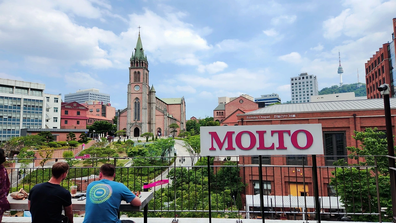 1. 커피 한 잔으로 유럽여행 다녀올 수 있는 몰토 명동의 명물 몰또는 말모말모. 명동성당이 바로 앞에 보이는 야외석은 늘 사람으로 붐빈다. 이 한 컷의 사진은 유럽의 어느 한 도시라고 해도 믿을 듯.