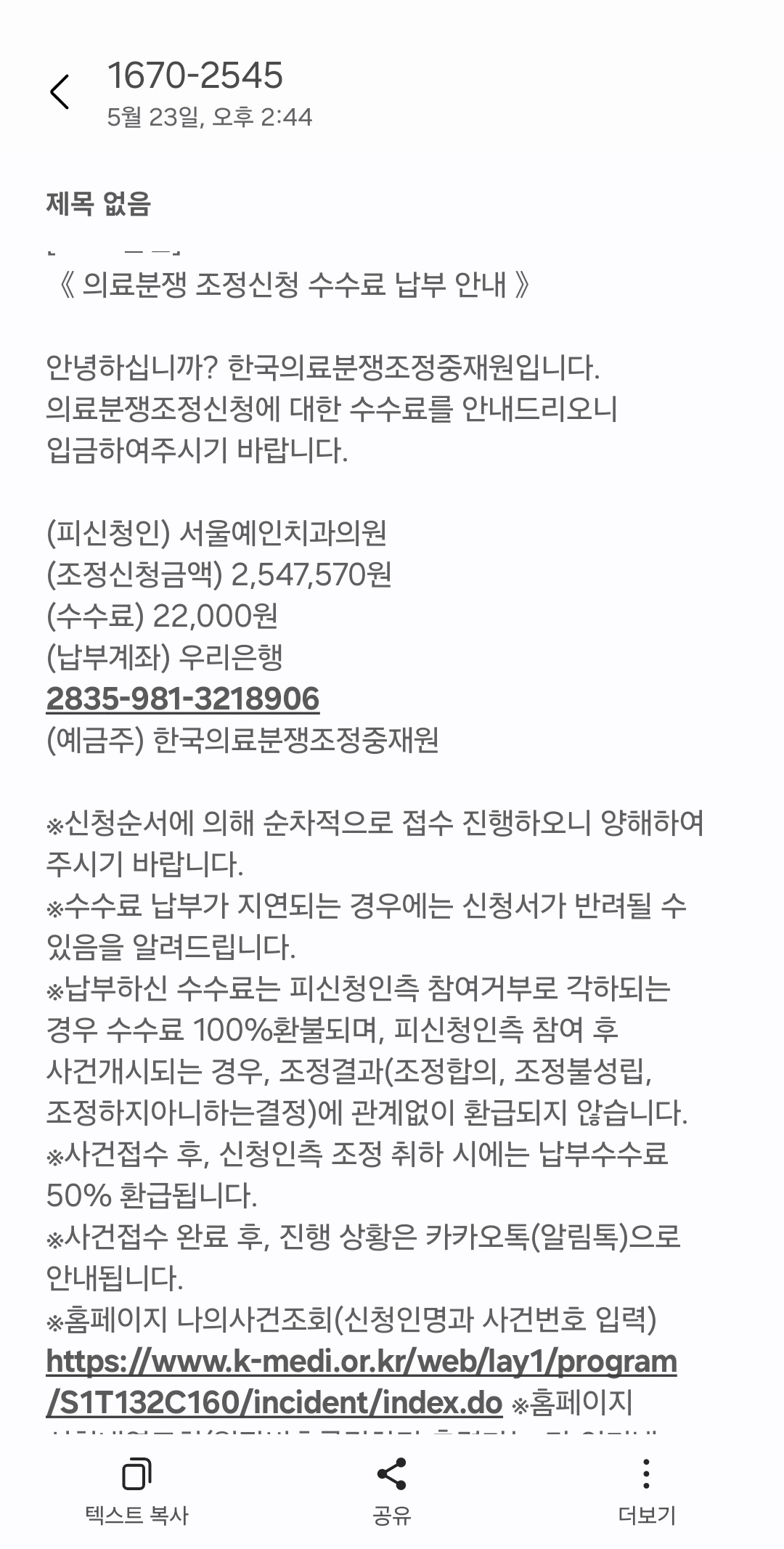 다만 차이점은 한국소비자원은 비용이 들지 않지만 의료분쟁조정중재원은 분쟁 조정 신청에 대한 수수료가 22,000원이 발생한다.