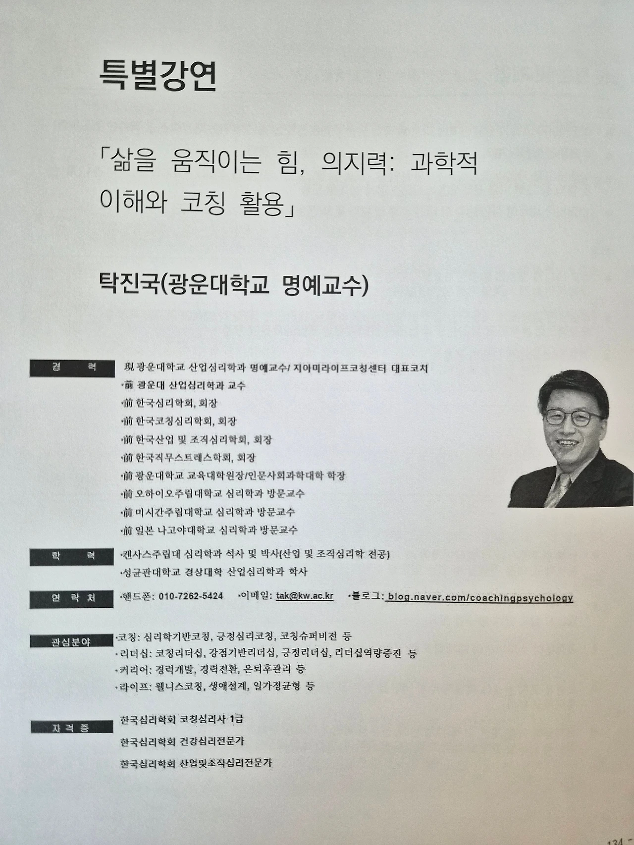 세션 중 가장 기억에 남는 것은 광운대 탁진국 명예교수의 의지력에 대한 특강이었다.
