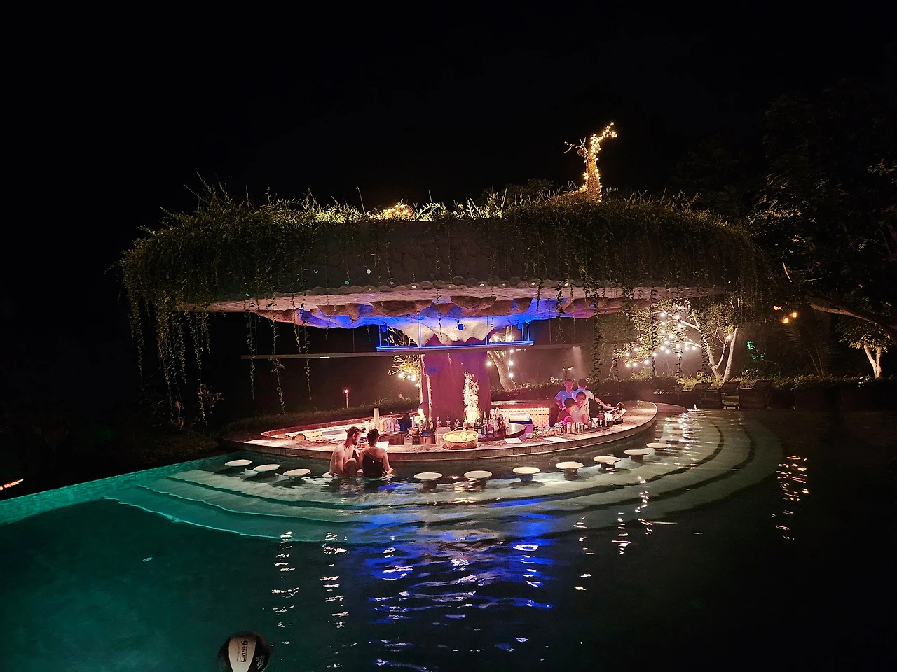 우붓 지역 특성상 우기에는 해가 지면 기온이 금방 떨어져, 다른 호텔에서는 낮에만 잠깐 수영하고 저녁에는 포기하는 경우가 많았는데 이곳은 체온 부담이 적어 상대적으로 오래 물에 있을 수 있었다.