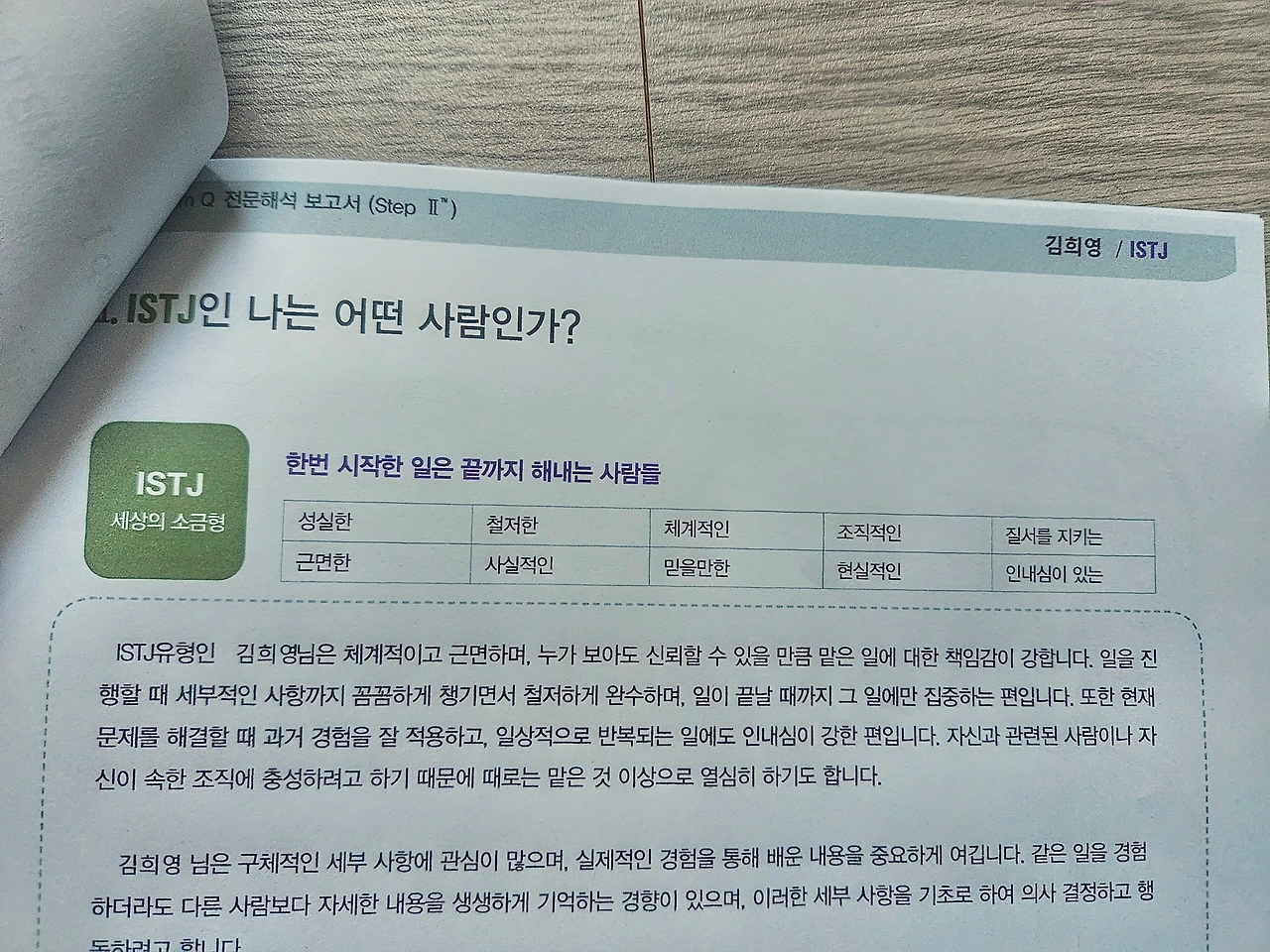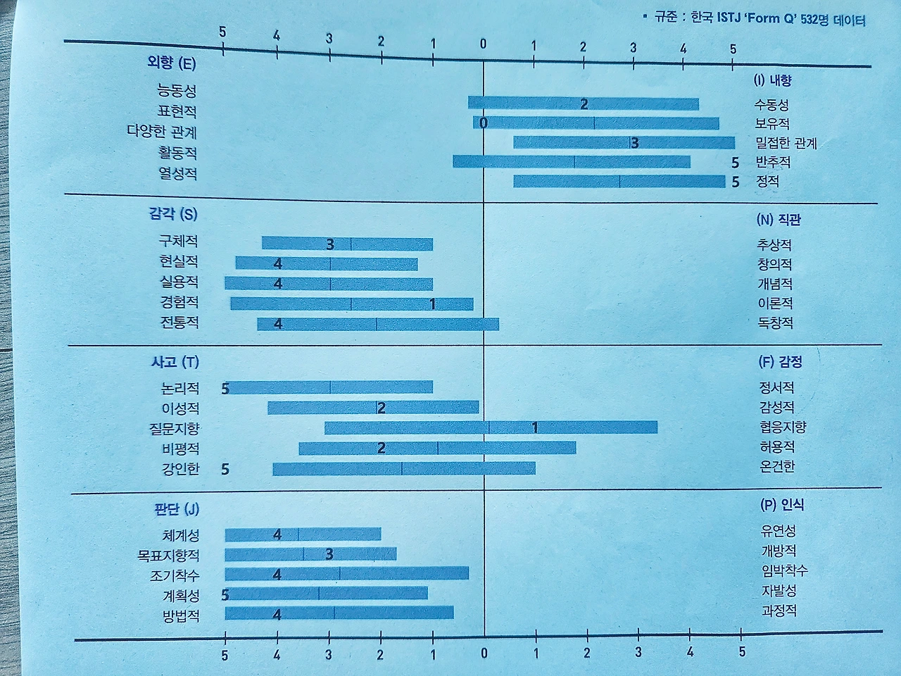 첫 번째는 부서 워크숍으로 동료 십여 명이 함께 했고, 두 번째는 부부 상담을 하면서 검사를 실시했다. 두 번의 검사에서 나는 모두 ESTJ가 나왔다. 그리고 부서 사람들의 80%가 ESTJ였고 남편 또한 같은 유형이었다.