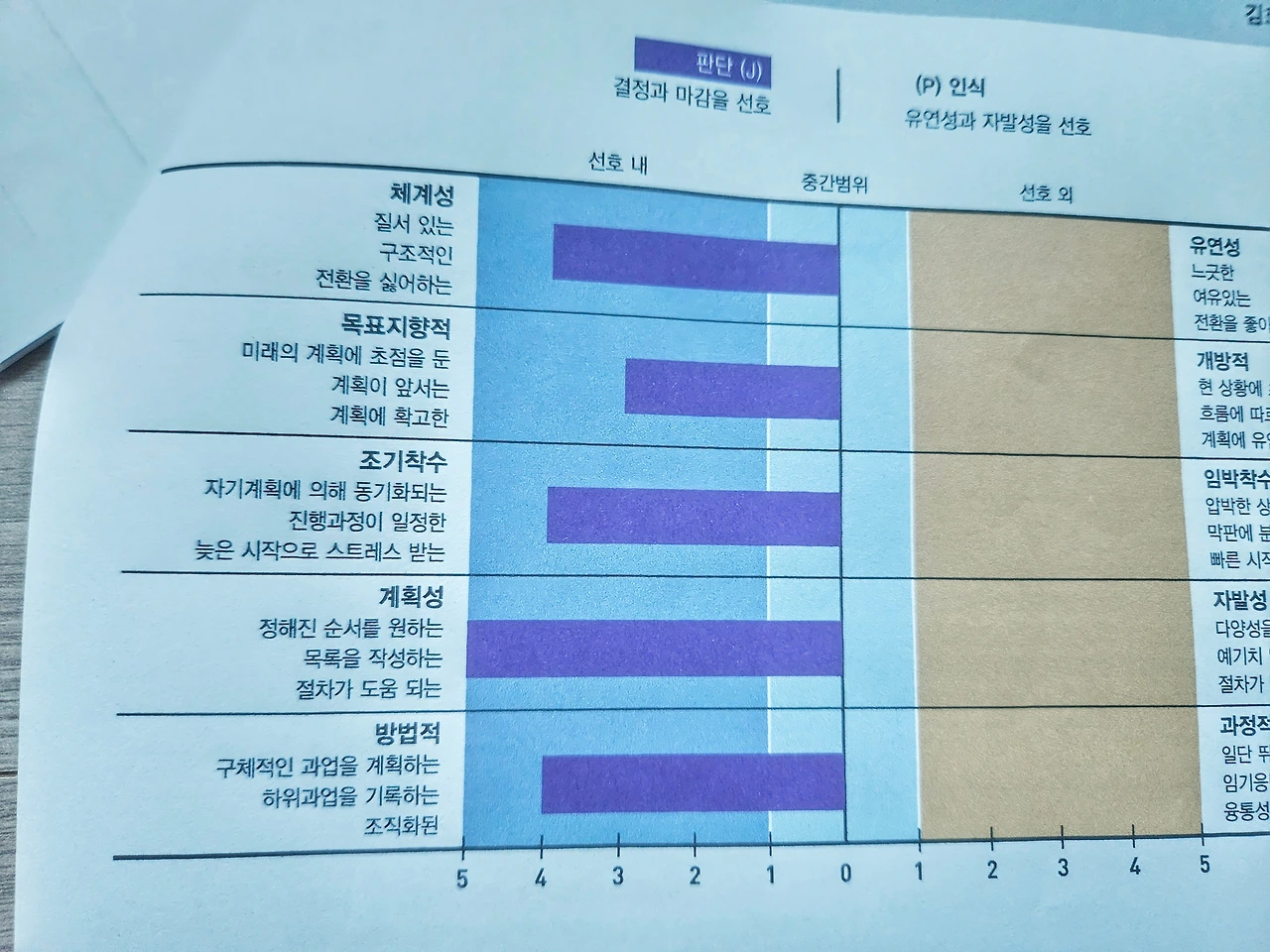 이런 생각을 할 때 즈음 MBTI 강사로 맹활약하고 있는 장정은 작가님을 통해 다시 검사를 해보았다. 십 수년이 지나면서 나의 성향은 바뀌었는지 궁금하기도 해서였다. 그렇게 내돈내산으로 검사해 본 결과 나머지는 동일했으나 E에서 I로 달라져 있었다. 그리고 그냥 J가 아니라 파워 J였다.