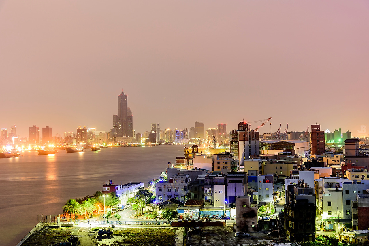 해저문 저녁시간, 치친에서 가오슝 시내를 물 건너 바라본다.