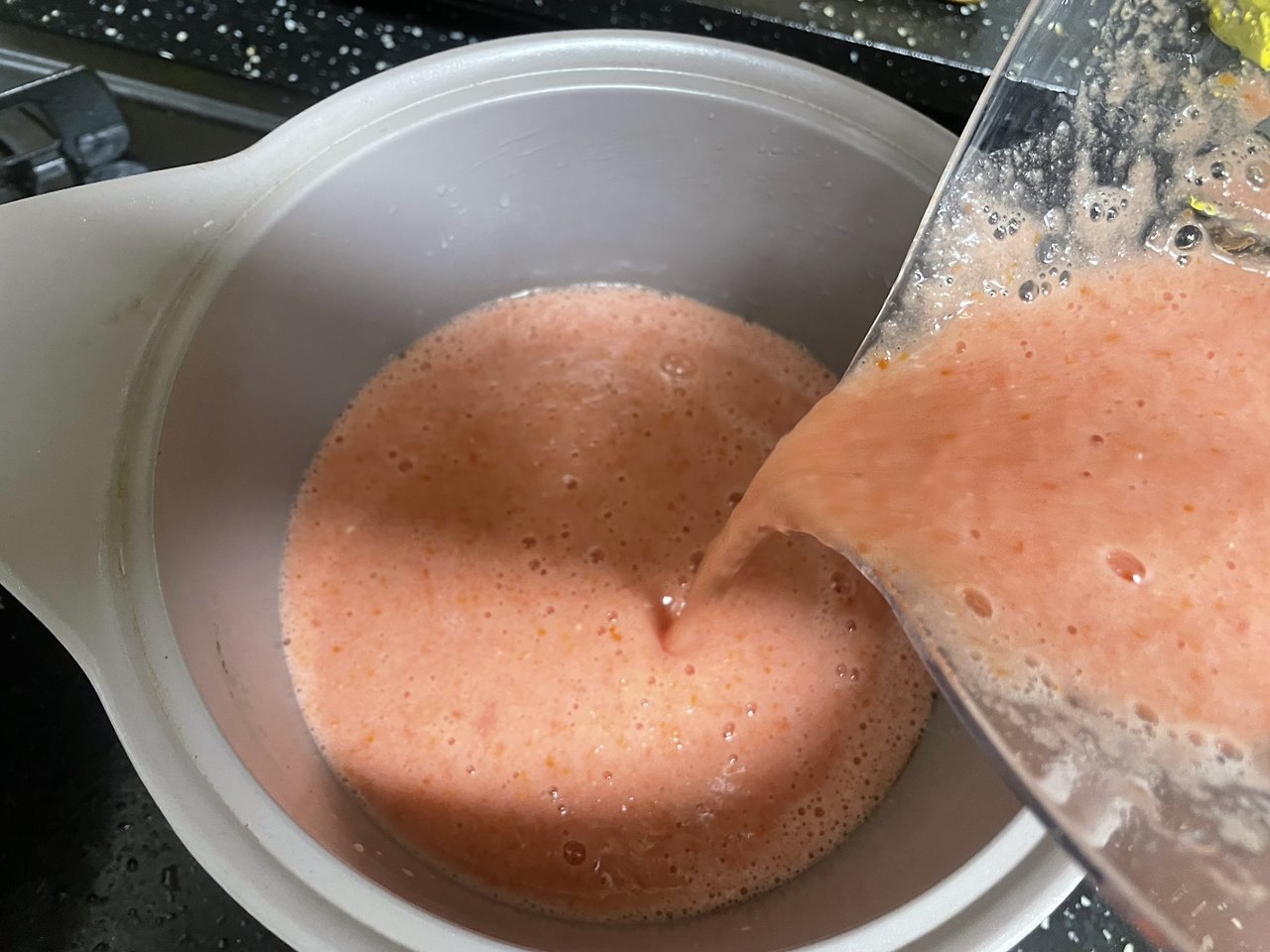 믹서기에 갈고 나면 토마토 색이 흐리멍텅해진다. 과육의 다양한 빛깔과 수분이 섞여 덩어리 상태에서 보여준 붉은빛이 사라진다. 분홍빛이 된 토마토 과즙을 그대로 냄비에 붓는다. 영양소 흡수력을 최대치로 끓어 올리기 위한 준비다. 토마토에 있는 라이코펜이라는 성분이 항산화작용을 도와주는 녀석인데, 지용성이라 열을 가할수록 흡수력이 좋아지기 때문이다.