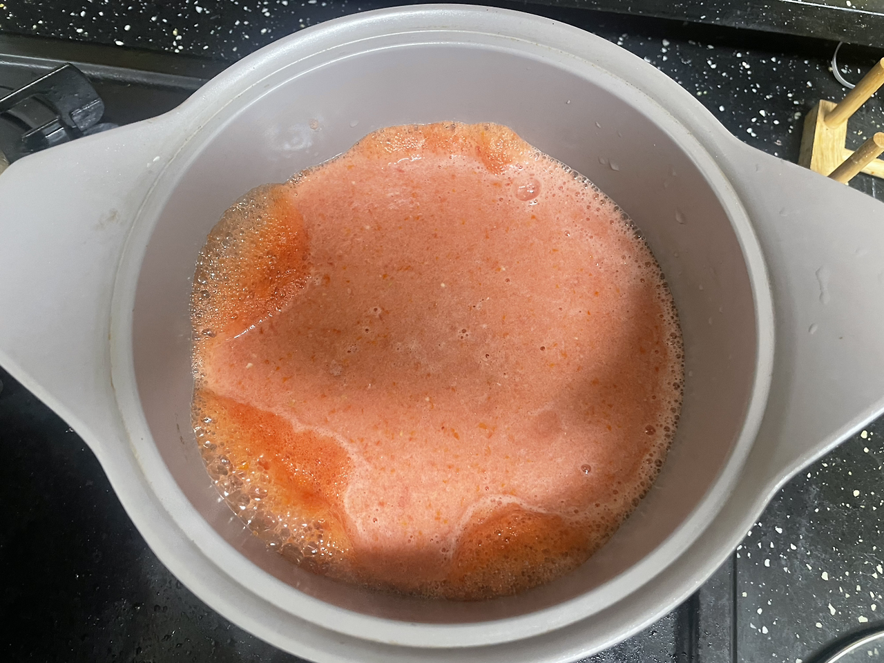 토마토 간 것을 불에 올려 15분간 저어가며 끓여 주는데, 신기한 과정이다. 처음 분홍빛이었던 토마토 과즙이 열을 가하면서 다시 붉어지기 시작한다. 5분쯤 지나면 본래의 붉기를 다시 회복한다. 토마토의 라이코펜은 토마토에 있는 붉은 색소 성분이다. 라이코펜이 열을 만나 어떤 반응을 보이면서 더 붉어지는 걸까?