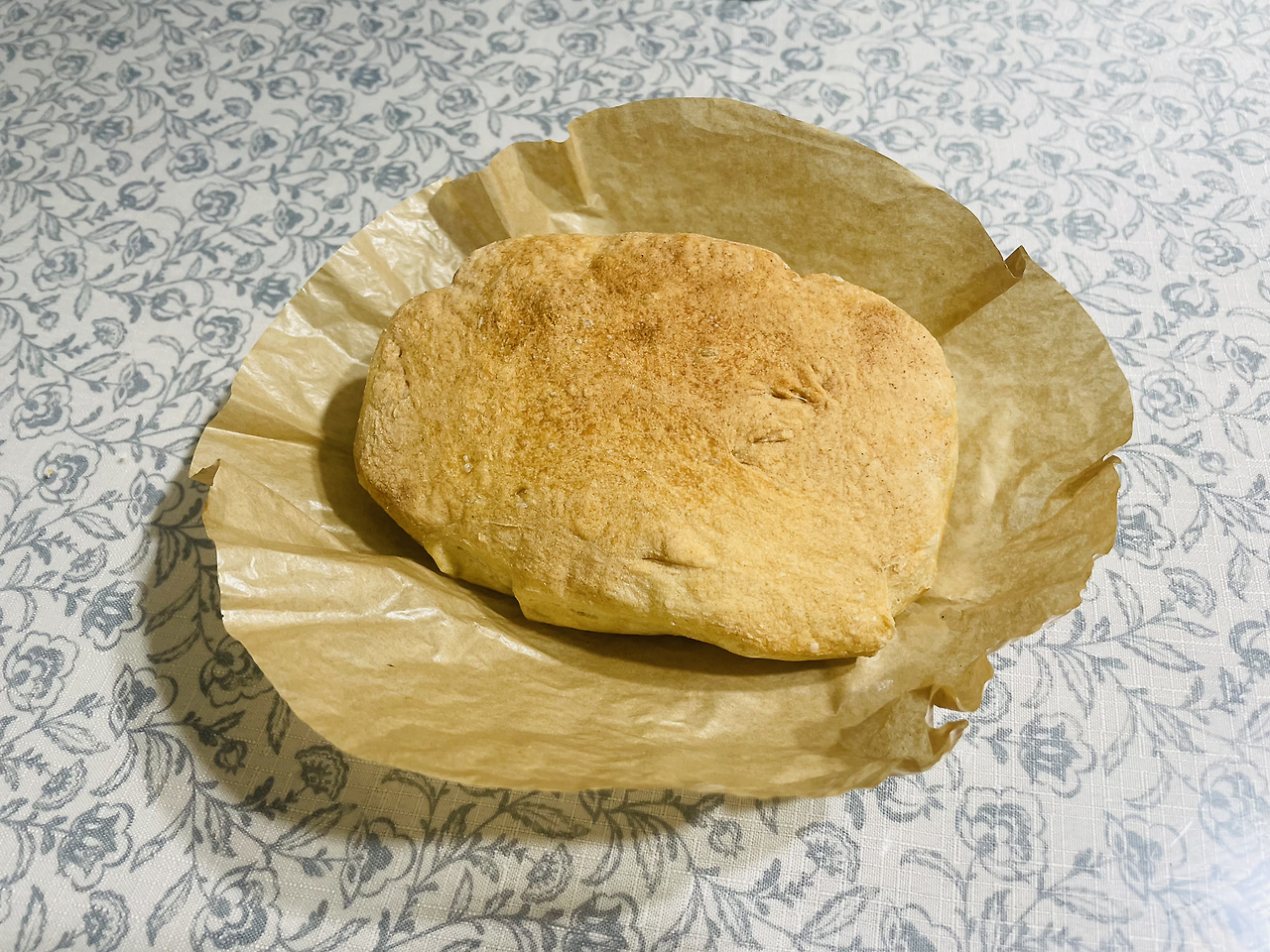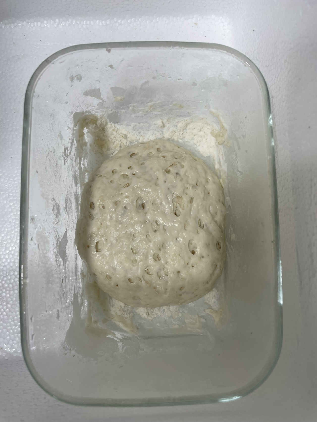 처음부터 다시 제대로 도전하기로 마음을 먹었다. 제대로 방을 구우려면 아무래도 강력분이 필요하다. 즉시 강력분을 주문했다. 집에 있는 통밀가루를 써보려고 했지만, 아직 빵의 기본도 모르는 내가 고수의 비법을 무시하고 다른 무언가를 만들어내기는 어렵다. 강력분을 받자마자 치아바타의 쫄깃한 맛의 비법인 비가 발효법을 사용해 보기로 했다. 처음 찾은 레시피는 밀가루 100, 물 120, 이스트 2로 비가를 만드는 것이었다. 밀가루보다 물의 비율을 더 많이 배합하고 이스트를 소량 넣어 24시간 발효했다. 기포가 올라왔다. 발효한 밀가루 반죽 위에 다시 밀가루와 물, 이스트를 더 넣고 30분씩 두 차례 발효하고 에어프라이기에 구웠다.
