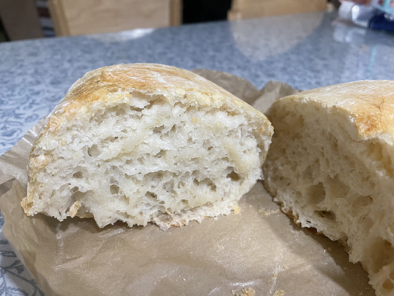 결국에 내 맘에 쏙 들게 완성했다. 치아바타 모양은 아니지만 말이다. 에어프라이어에서 꺼내자마자 반으로 자르니, 껍질에서 바삭하고 소리가 난다. 그 안으로 기포가 송송송 보이는 빵의 속살. 너무나 예쁘게 구워진 빵을 보며 좋아서 어쩔 줄 몰랐다. 처음으로 뒤집기에 성공한 아들을 보았을 때의 기분이랄까. 혼자 좋아서 폴짝폴짝 박수를 치고 행복한 미소가 절로 나온다.