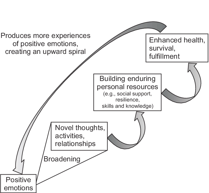 긍정심리학자인 바버라 프레드릭슨이 제시한 긍정 정서의 확장 및 구축 이론(broaden-and-build theory)에 따르면 긍정적 정서는 사람들의 관점과 행동을 넓게 확장시켜주고, 이것이 장기적으로는 삶을 성공적으로 살아가는데 필요한 능력과 자원을 구축해 줍니다. 그런 결과로 또다시 긍정적 정서를 많이 느낄 가능성도 높아집니다.