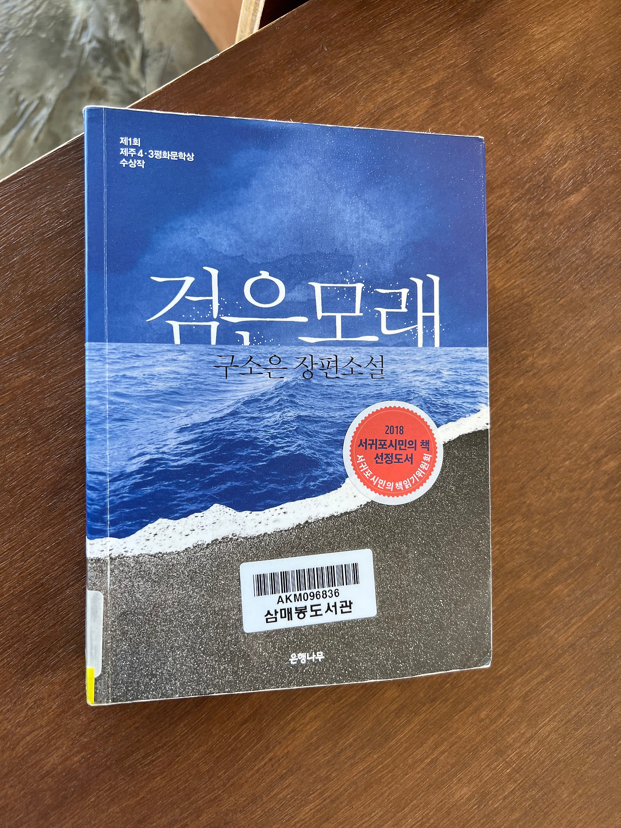 사실 나는 이미 다른 책을 이 여정의 첫 번째 책으로 골라놓았다. 미국인의 시각으로 본 제주의 근대사에 대한 <해녀들의 섬>. 마침 독서모임의 6월 책 추천 차례가 되어 이 책은 그때 함께 읽겠다며 아껴두고 또 다른 책을 찾아 나섰다. 그러다 해녀 관련 연구 논문들을 검색하다 우연히 "제주 우도의 검은 모래밭에서 미야케지마까지 디아스포라 장소 담론 -구소은의 <<검은 모래>>를 중심으로"라는 논문을 발견했다. 이 논문은 구소은 작가님의 <검은 모래>라는 소설을 기반으로 쓰였다. 소설 속 주인공인 재일한인 제주해녀(해금)의 이방인으로서의 이주 역사를 통해 공간(장소)의 의미와 인물들이 가진 정체성을 분석한 논문이다. 찾아보니 이 소설은 제1회 제주 4.3 평화문학상 수상작이었고, 2018년 서귀포 시민의 책 선정도서란다(표선도서관에는 서귀포 시민의 책 선정도서 칸이 따로 있다!).
