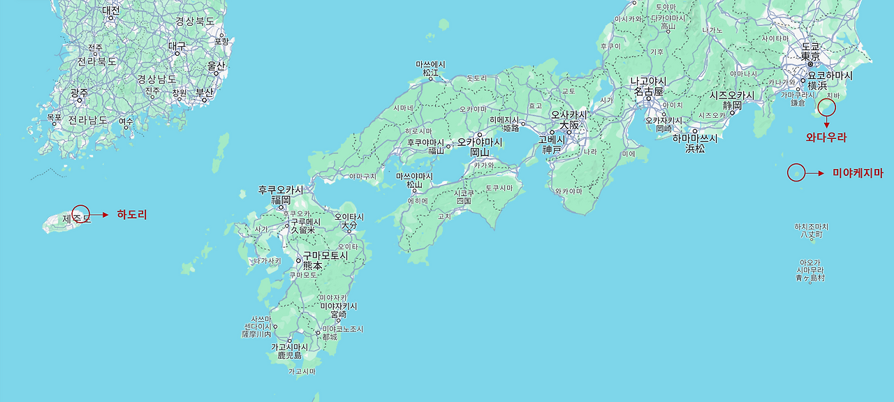 우도는 구월의 고향이었고 구좌읍 하도리로 시집을 간다. 해금은 하도리에서 태어났다. 일본 미야케지마에는 구월의 시누이인 임례가 먼저 터를 잡았고, 구월과 해금, 기영도 옮겨와 함께 살았다. 미야케지마 아코라는 곳은 해금이 결혼하여 살던 지역이다. 화산섬 미야케지마의 주요 화산인 오야마산은 1962년, 1983년 폭발이 있었고, 2000년 화산 분출 후 주민 대피령이 실시되었다가 2005년에 대피령이 해제되었다. 도쿄는 기영이 공부하던 곳이었고, 오사카는 임례의 막내딸이 시집가 임례 가족이 이주하게 된 도시다. 와다우라에는 많은 해녀들이 정착했던 곳인데, 구월과 해금이 전쟁시절 잠시 살았던 지역이다.