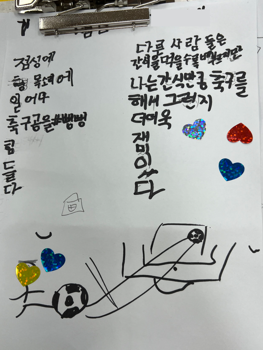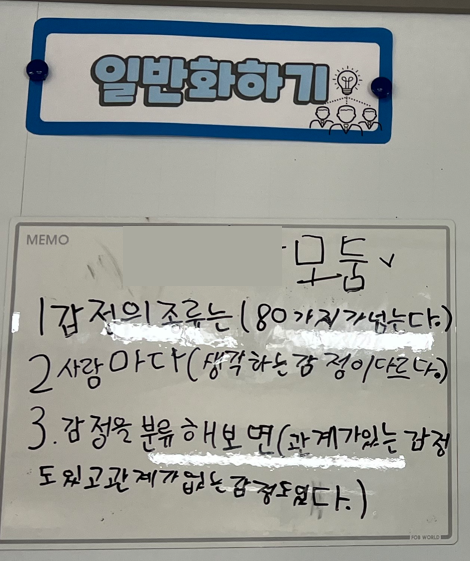 3학년인 둘째 아이는 "우리 자신을 표현하는 방법"이라는 초학문적 주제를 가지고 3월 활동을 진행했는데, "사람들은 감정을 주고받으며 관계를 맺는다"는 중심 아이디어를 가지고 감정의 종류, 표현 방법, 그리고 감정을 대하는 자세에 대해 다양한 활동을 통해 탐구했다('공부했다', '학습했다'가 아니라 '탐구했다'가 핵심이다. 아이는 집에 돌아와서 뭘 했냐고 하면 뭘 배웠다는 말 대신 '탐구했다'는 말을 곧잘 한다). 감정 사전을 만들기 위해 국어사전 낱말 찾기 놀이를 했고, 감정의 종류에 대한 탐구를 마친 후 탐구 전후의 생각 변화 차트를 만들어 짝에게 설명하고 모둠별로 일반화 문장을 만들었다. 다양한 종류의 감각을 통해 '추리'하는 활동을 통해 과학을 다뤘고, 시를 읽고, 쓰며 감정과 생각을 공유했다.