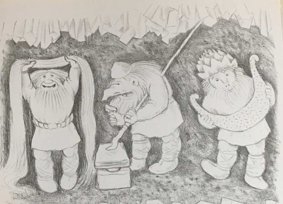 지하세계에는 온갖 것이 다 있습니다. '나의 세계 나무'의 뿌리를 갉아먹는 해충이 있는가 하면 생명이 되는 샘도 있지요. 만약 지하세계를 우리 내면의 세계라고 볼 때 여기에는 과거에 죽은 정신적인 것들이 다 있겠지요. 어떤 것은 완전히 죽지 않고 좀비처럼 살아있을 테고요. 또 어떤 것은 아주 잘 죽어서 더 귀한 아이로 정신이 새롭게 태어나겠지요. 북유럽 신화에는 금은보화를 좋아하며 황금이 묻힌 곳을 알고 지키는'난쟁이'가 지하에 산답니다. 이 난쟁이들이 신비한 마법의 물건과 아주 귀한 예술작품을 만듭니다.
