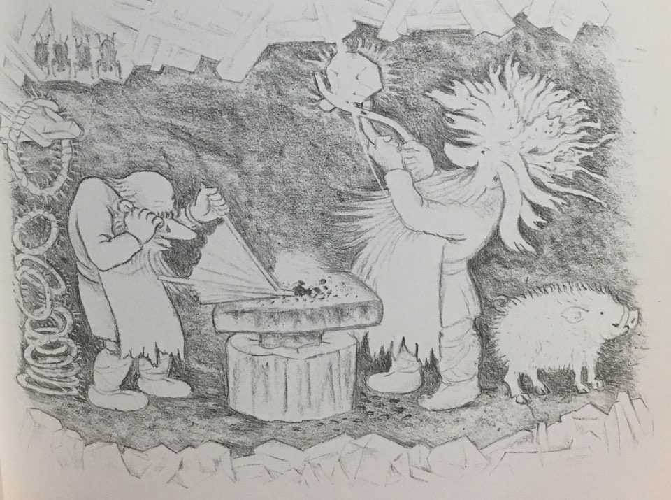 다른 난쟁이가 듣고 은근히 화가 났다. 이 난쟁이 형제도 대단한 기술을 가진 대장장이였기 때문이었다. 결국 로키와 목숨을 건 내기를 하게 된다. "더 뛰어난 물건을 만들 테니 두고 보자!" 난쟁이들은 열심히 풀무질을 하며 물건을 만들어낸다. 내기에서 질까 봐 로키는 파리로 변신해 이들이 작품을 만드는 동안 눈 앞에서 방해하거나 목에 달라붙거나 하면서 계속 성가시게 해서 하마터면 작업이 중단될 뻔하기도 한다. 형이 아우에게 말한다.