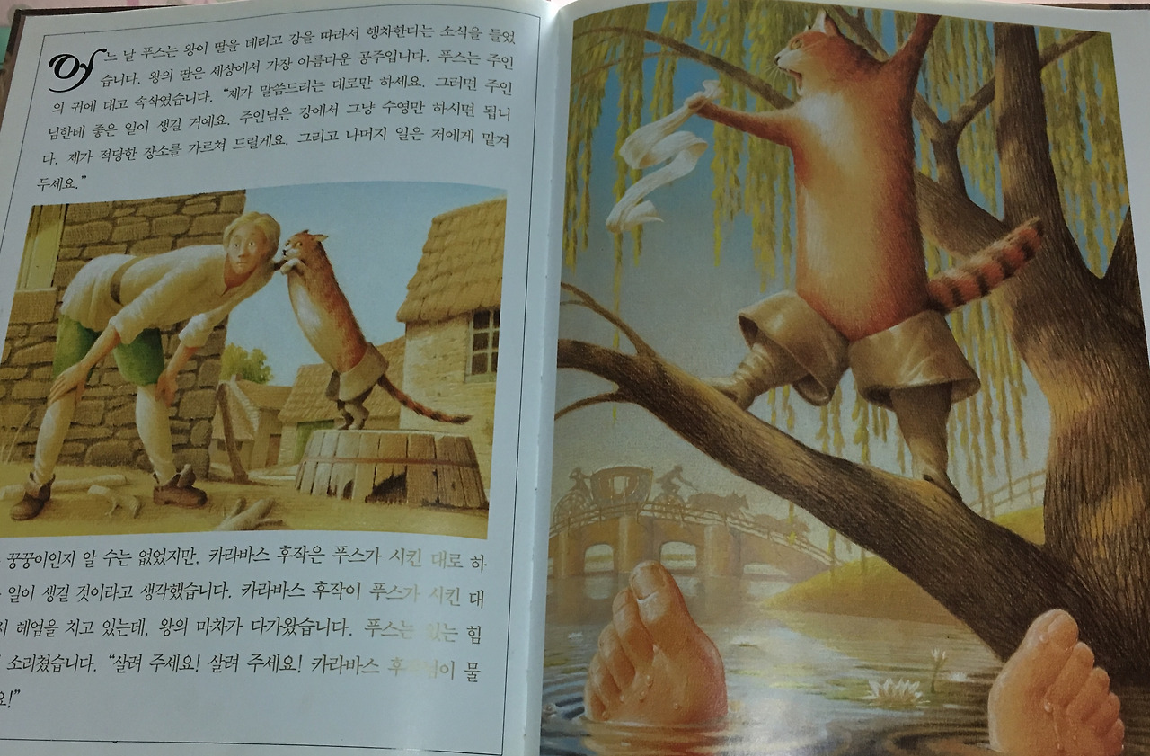 그러던 어느 날 왕이 공주와 마차를 타고 강가를 산책한다는 말을 들었다. 푸스는 막내에게 자기가 알려주는 곳에서 수영만 하고 있으라고 했다. 막내가 수영을 즐기고 있을 때 왕의 마차가 보이기 시작했다. 푸스가 소리쳤다. “카라바스 후작님이 물에 빠졌습니다!”