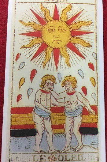 마르세유 타로의 19번 태양에는 금발의 두 남자가 있습니다. 이들은 작렬하는 태양 아래에서 서 있습니다. 태양에서는 빛과 열기가 굵은 물방울처럼 후두둑 떨어지고. 젊은이들은 벌거벗은 채 허리춤에는 천을 둘렀고 목 부분은 빨갛습니다. 그들 뒤편에는 낮은 벽돌 담장이 있습니다. 두 젊은이는 서로의 몸에, 한 사람은 상대의 머리 쪽에 또 한 사람은 상대의 가슴에 손을 대고 있습니다. 이런 땡볕에서 이들은 무엇을 하고 있는 걸까요? 이 두 사람은 어떤 관계일까요? 그림을 보고 여러분이 추측해 보시기 바랍니다.