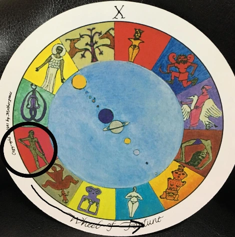 왼쪽에 있는 뱀은 아래로 떨어지고 있습니다. 뱀은 형 오시리스 Osiris를 죽이고 왕이 되려 했던 이집트의 사악한 왕 세트 Seth를 가리킵니다. 뱀을 티폰 Typhon으로 보기도 합니다. 여기서 뱀은 지혜와 치유, 창조의 에너지를 상징하면서 또한 실패와 악에 대한 표현이기도 합니다. 바퀴 표면의 오른쪽에 있는 동물은 사자(死者)를 오시리스에게 인도하는 이집트의 아누비스 Anubis입니다.