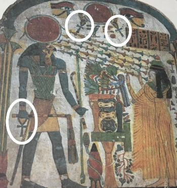 Ankh 앵크 : 앵크는 이집트에서는 생명의 상징이다. 우주, 인간과 신 둘 다를 포함한 모든 생명체, 신비와 숨겨진 지혜를 밝혀내는 지식의 열쇠, 힘, 권위, 서약을 뜻한다. 앵크의 형상은 신 오시리스를 나타내는 남성 상징과 여신 이시스의 여성 상징이 결합된 모양이며, 두 가지 생성원리인 하늘과 대지의 결합을 나타낸다. 앵크는 불사不死 , 내세, 미래를 상징하기도 한다. 일설에는 앵크가 '생명의 나무' 형태로 타원 부분은 영원, 십자는 종횡으로의 확장, 즉 시간과 공간의 무한성을 나타낸다고 한다. (보통은 샌들을 묶는 끈의 모양, 또는 일종의 부적이라고 추측한다.) '진리의 여신' 마트는 손에 앵크를 들고 있다. (진 쿠퍼 <그림으로 보는 세계 문화 상징 사전> 까치 p16에서)
