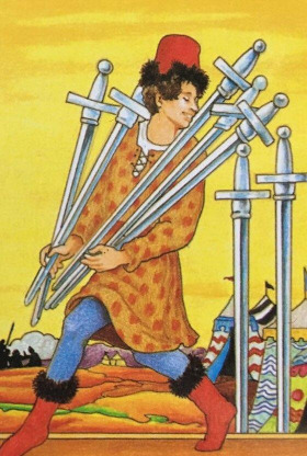 프라다 타로 카드에서 바보는 광대로 그려집니다. 빨간색 광대 옷 끝자락에는 주렁주렁 방울이 달려 있고 흰색 주머니가 달린 지팡이를 어깨에 메고 있어요. 앞에는 이빨을 드러낸 초록 괴물이 있는데 그는 전혀 무서워하지 않고 오히려 괴물을 속여 넘기려 하고 있어요. 트릭을 쓰는 거지요. 몸은 마치 뒤쪽으로 가는 것처럼 죽 빼고 있지만 사실 두 다리는 앞으로 가고 있습니다. 그 반대로 하고 있는 것일 수도 있고요. 괴물을 헷갈리게 할 목적인 듯해요. 어쩌면 흰색 주머니에 든 건 괴물에게서 훔쳐온 것인지도 모릅니다. (유니버셜 웨이트의 칼7번에 나오는 사람과 비교해 보세요. 비슷한 점과 차이점이 있어요.)