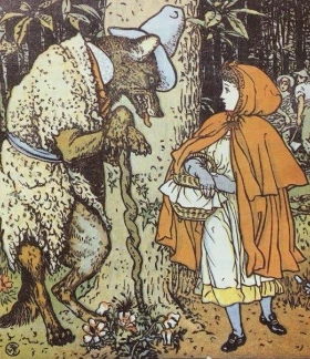늑대가 빨간 모자에게 다가가 물었다. "어디 가니?" "바구니에 든 건 뭐니?" 그때마다 빨간 모자는 대답했다. "할머니한테." "구운 과자와 포도주야." 늑대가 또 물었다. "할머니는 어디 사시니?" 빨간 모자가 대답했다. "숲 속으로 십오 분쯤 더 들어가 떡갈나무 세 그루가 있고 개암나무 울타리가 있는 데야." 늑대는 빨간 모자와 함께 걸었다. 늑대가 권하는 말에 따라 눈을 들어 주위를 둘러보니 햇살이 빛나고 여러 예쁜 꽃들이 피어 있었다. 빨간 모자는 할머니에게 줄 꽃다발을 만들기 위해 꽃을 꺾었고 점점 숲 속으로 더 들어갔다. 그 사이 늑대는 할머니 집으로 가 할머니를 잡아먹고 할머니 인척 침대에 누워 빨간 모자를 기다린다. 이윽고 할머니 집에 도착한 빨간 모자는 평소와 달리 문이 열려 있고 왠지 모르게 불안했지만, 할머니가 있는 침대로 다가간다. 할머니의 귀와 손과 입이 너무나도 크고 이상해서 질문을 던지지만, 미처 피하지 못하고 늑대에게 잡아먹힌다. 배가 부른 늑대는 코를 골며 자기 시작한다. 이때 사냥꾼이 지나가다 소리를 듣고 이상한 낌새를 채고 할머니 집으로 들어간다. 사냥꾼은 늑대 뱃속에서 소녀와 할머니를 꺼내고, 대신 돌덩이를 넣는다. 늑대는 뱃속이 너무 무거워 죽고 만다. 이 일을 겪은 뒤 늑대를 또 만나게 되는데, 소녀와 할머니는 지혜롭고 통쾌하게 늑대를 잡는다. 소시지를 구운 솥에 물을 넣고 끓이자, 소시지 냄새를 맡던 늑대가 끓는 물에 빠져 죽은 것이다. (<그림 메르헨> 문학과지성사 참고)
