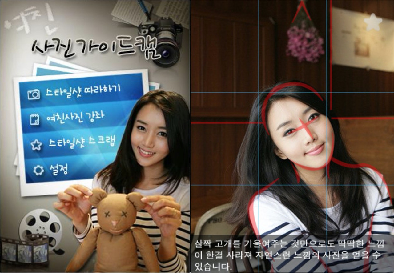 스마트폰 보급 초기에 화제가 됐던 ‘여친 카메라’라는 앱이 있습니다. 데이트 중에 연인을 예쁘게 찍어주고 싶지만 사진에 대해 잘 모르는 사람을 도와주는 용도의 앱인데, 보통의 카메라와는 다르게 인물의 포즈가 그려진 화면 속 안내선이 특징입니다. 사진을 찍을 때 안내선 대로 자세를 잡은 뒤에 촬영하면 예제 사진처럼 멋진 사진을 얻을 수 있죠. 사교육에 의존하는 한국사회의 모습을 반영한 것 같아 살짝 아쉽긴 하지만 사진 교육 기회가 없던 사람들을 위해서는 대단히 좋은 기술이라고 생각했습니다.