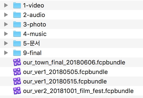영상물을 하나 만들면 다양한 형태의 파일이 생성된다. 프로젝트 파일, 소스 파일(동영상,사진,그래픽(효과),사운드,음악,자막), 문서, 출력파일(러프컷,파이널컷,클로즈드캡션)까지. 이렇게 많은 파일을 한 폴더에 몰아 넣고 편집하는 건 정신 사납고 시간이 많이 잡아먹고 분실의 위험도 많은 아주 안 좋은 습관이다. 폴더 분류 방법에 정답은 없지만 파일 유형이나 용도에 따라서, 촬영한 시기나 공간에 따라 폴더를 만들고 그 하위 폴더에 나머지 파일들을 집어넣으면 편집을 더욱 효율적으로 할 수 있다.